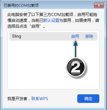 3.此后如果又弹出一个询问您是否禁用的窗口,一定要选“否”;如果未弹出窗口,直接重启WPS即可。
